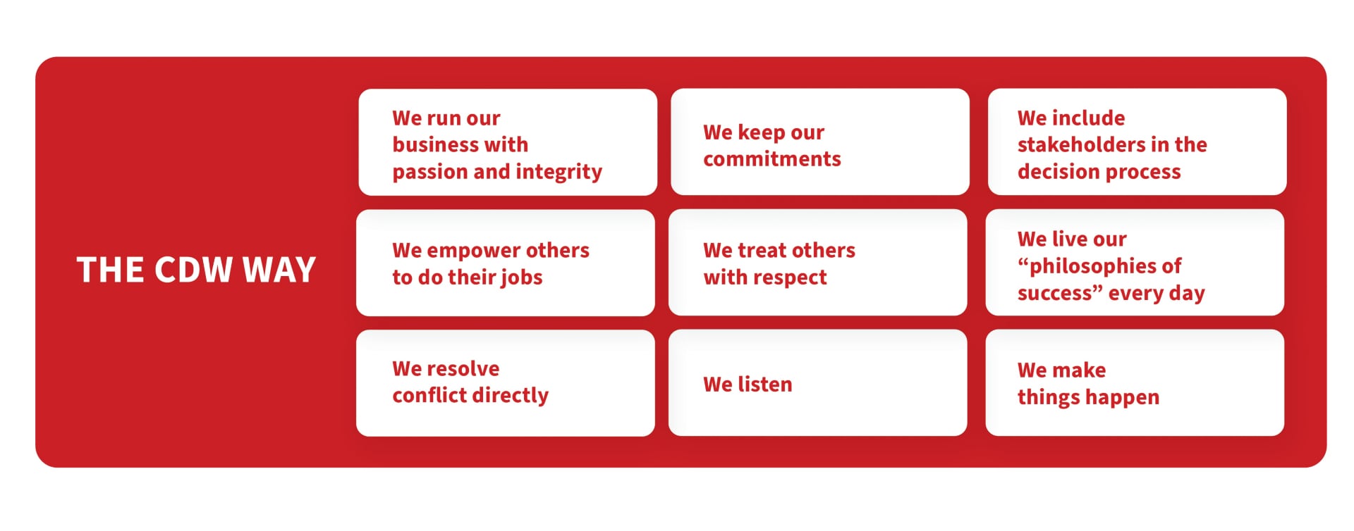 At CDW, we understand that integrity, trust and good corporate governance matter to all our stakeholders. By ensuring smart governance and ethics and compliance practices, we continue to earn the trust and confidence of our stakeholders, which enables us to sustain our success and create long-term shareholder value.