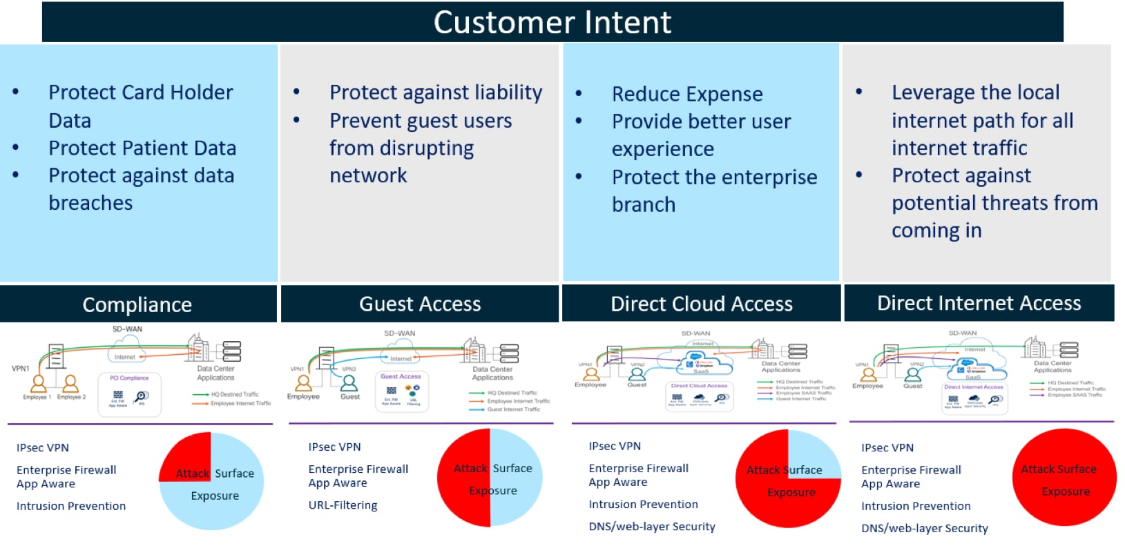 With SD-WAN security, Cisco was looking to solve four common branch security use cases for customers, implementing security solutions to solve for each use case.
