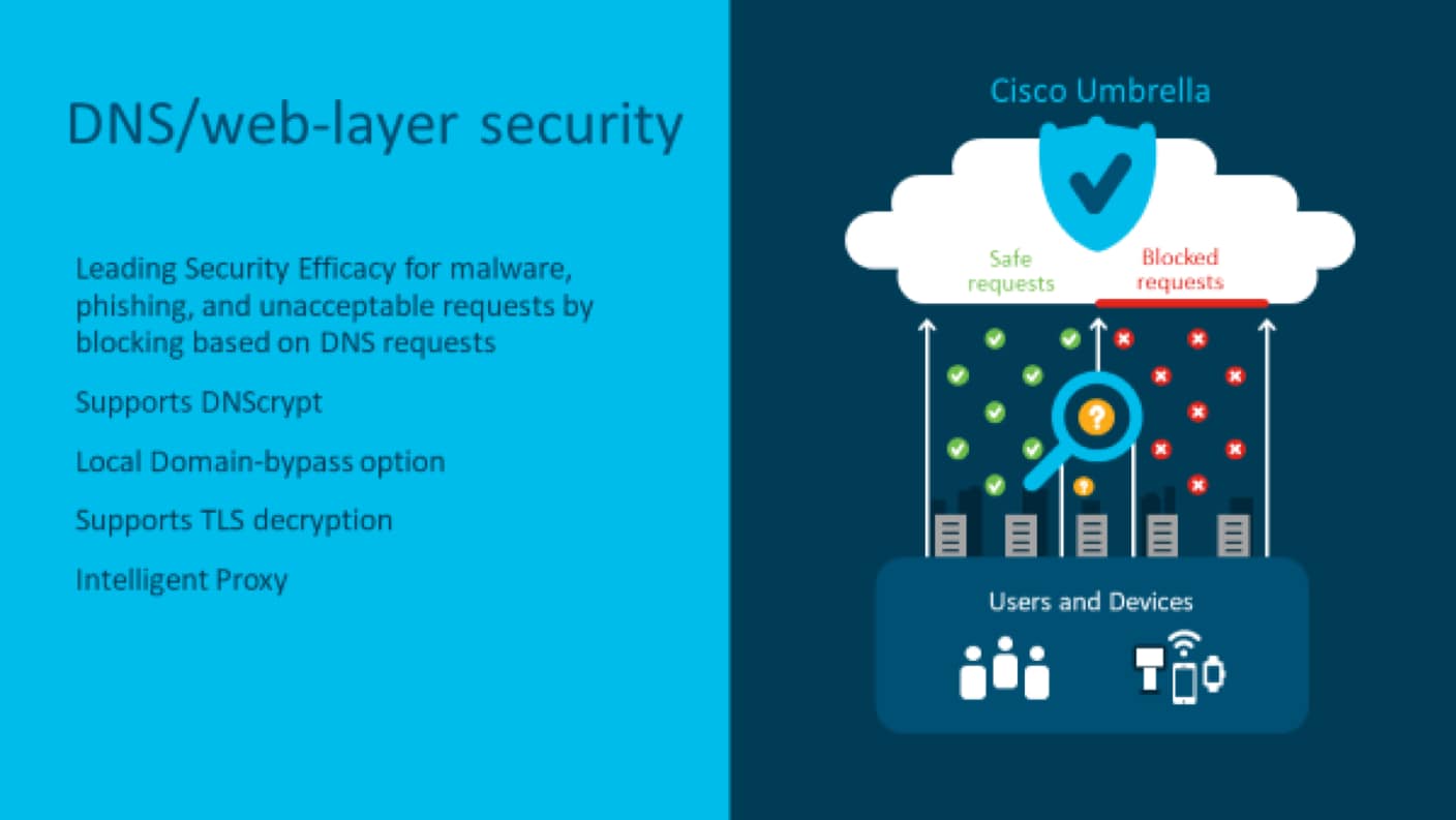 With this feature, we are looking at the Domain Name System (DNS) layer, whereas with URL filtering, we are looking at the application layer (HTTP or HTTPS). The DNS requests are interpreted, redirected from their intended DNS server to the Umbrella cloud servers encrypted using DNSCrypt. With this DNS request, the user’s inside IP address and the device identity are also sent. Once Umbrella receives this DNS request, it will process it through your defined policy and respond with either the correct IP address of the service or any IP address redirecting the client to a block page. Umbrella also supports some advanced features such as Intelligent Proxy with options like SSL Decryption.