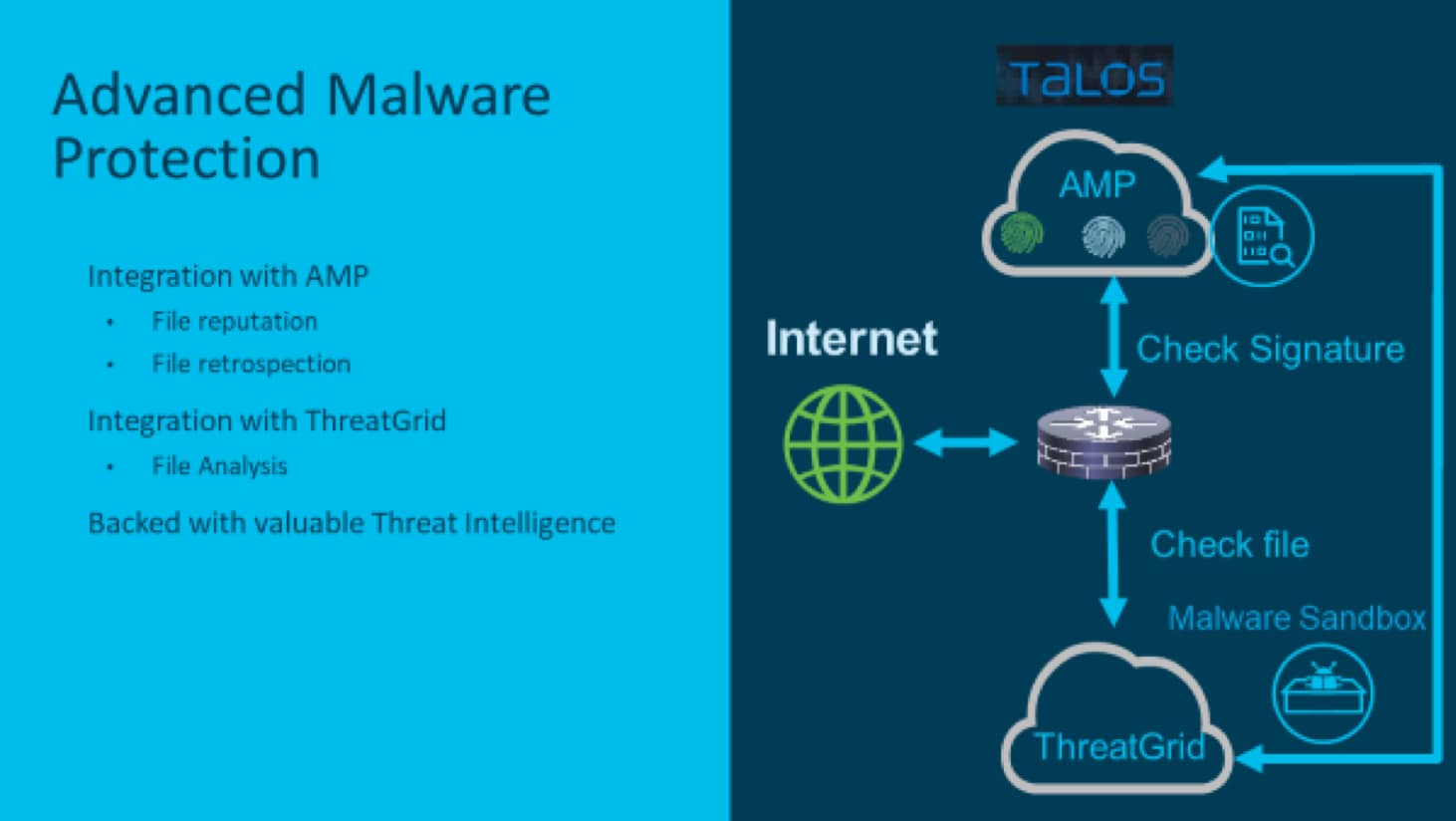 AMP will allow the router to look at files downloaded from the internet over protocols such as HTTP, SMTP, IMAP, POP3, FTP and SMB. As the router observes the file, it will generate a SHA 256, which will be sent to the Talos AMP Cloud where the SHA 256 is compared against AMP’s database. It will then return a file disposition informing the router of the file’s maliciousness. If the AMP database does not have a record for the file, this is where ThreatGrid comes in.